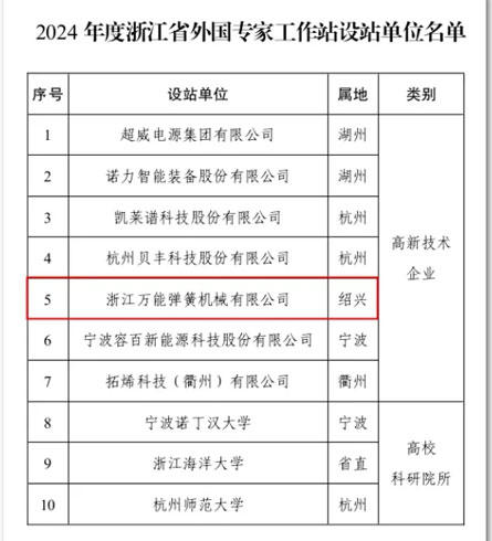 19th 12.2024 在全球化與科技創(chuàng)新的驅(qū)動下,浙江省外國專家工作站成為吸引國際高端人才、推動企業(yè)創(chuàng)新發(fā)展的重要平臺。自2020年《浙江省外國專家工作站管理辦法》實(shí)施以來,紹興市在吸引外籍專家方面取得了顯著成績。截至目前,紹興市已有6家單位獲批為省級外國專家工作站,位居全省前列。 2024年,浙江萬能彈簧機(jī)械有限公司榮...
